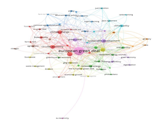 The keywords in Figure 1 are divided into 9 different color sets. The fact that the keyword clusters are the same color shows that these words are used together a lot. The closeness between the keywords indicates that these words tend to be in the same study (Yalçıntaşet al., 2023, p. 5). Furthermore, the keywords at the center of this network of relationships show that it has a wider range of relationships compared to those at the edges (Waltman, Eck, & Noyons, 2010, pp. 629–635). When the keywords are examined, it is revealed that the European Green Deal mainly focuses on two concepts. The first of these is the economy. The expressions used in the field of economics are based on circular economy, sustainable development and bioeconomy. The "EU taxonomy" (Güney and Saraç, 2022, p. 118), which is a classification system that supports green and sustainable economic activities and identifies environmentally compatible financial market instruments, is the keyword with the least connection with other keywords in the economy and the least frequency of use (6 times).
