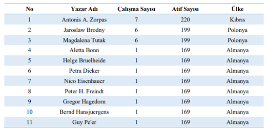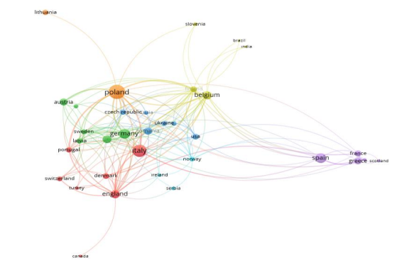 The links between the countries in Figure 2 show the citation relationship between academic studies. However, since the links do not point to a direction, the countries of the cited and cited authors are not identified. Therefore, the links indicate that there is a relationship between the studies. When these connections are examined, it is seen that Lithuania, India, Chile, Brazil, Canada, Slovenia and Scotland have citation relations with a small number of different countries. .Italy, Poland, Germany, Holland and England are the countries with the most citation links.