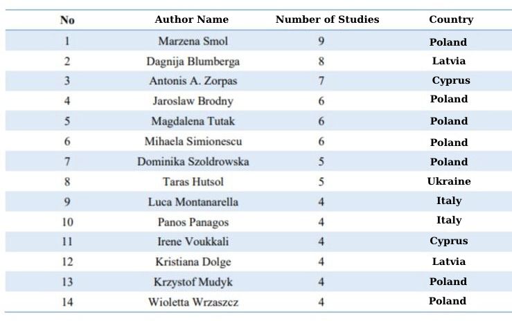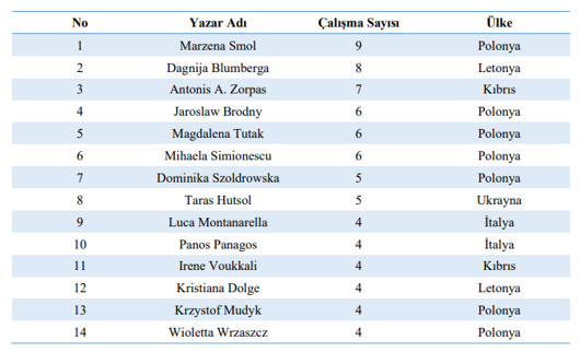 Author analysis is meaningful in terms of showing which authors researchers who will work in this field can turn to. Table 2 lists authors with at least four studies. When Table 2 is examined, it is seen that the people who have done the most work on the European Green Deal are Marzena Smol (9 studies), Dagnija Blumberga (8 studies) and Antonis A. Zorpas (7 studies). Considering that a total of 8 studies were carried out in Cyprus within the scope of the country analysis in Figure 2, it is revealed that 7 of them were conducted by Antonis A. Zorpas and 1 by Irene Voukkali. In addition, in Poland, which is the country with the most studies, it is seen that the prominent authors are Marzena Smol, Jaroslaw Brodny, Magdalena Tutak, Mihaela Simionescu, Dominika Szoldrowska, Krzystof Mudyk and Wioletta Wrzaszcz. In Latvia, where a total of 22 studies were included, 12 of the studies were carried out by Dagnija Blumberga and Kristiana Dolge. The striking point about the author analysis is that there are differences in the list of authors with the most studies shown in Table 2 and the most cited authors in Table 3.