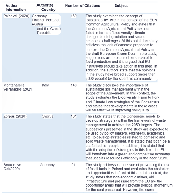 The information of the most cited studies is shown in Table 4. Examining the content of these studies is important in terms of showing the trend of the literature. When Table 4 is evaluated, it is seen that the two most cited studies are for the agricultural strategy of the European Green Deal. The keyword cloud in Figure 1, on the contrary, showed that the number of studies in the field of agriculture was less. Therefore, when these two most cited studies are compared with the keyword cloud, it is understood that the cited studies do not focus on the "agricultural strategy" area of the Consensus.