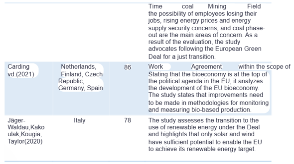 Unlike the existing bibliometric analysis literature, this study conducts research specific to the European Green Deal announced by the EU in 2019. This purpose also reveals the limitations of the study. In order to distinguish from the studies on "green deal/deal" in the literature, studies on the expression "European Green Deal", which is the full name of the announced initiative, are examined. In addition, this study deals with all academic publications that deal with this initiative instead of titles. The study evaluates this issue within the scope of the following questions: