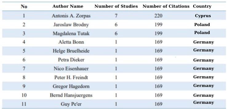 Table 3 lists the 11 most cited authors. When the most cited authors are examined, different names from Table 2 stand out. At this point, Antonis A. Zorpas (220 citations and 7 studies), Jaroslaw Brodny (199 citations and 6 studies), and Magdalena Tutak (199 citations and 6 studies) are the most cited authors, according to citation analysis. In addition, when Table 3 is examined within the scope of co-authorship analysis, it is seen that one of the most cited (169 cited) studies is a joint study conducted with different researchers. Figure 3 below reveals the connections between these co-authors more clearly.