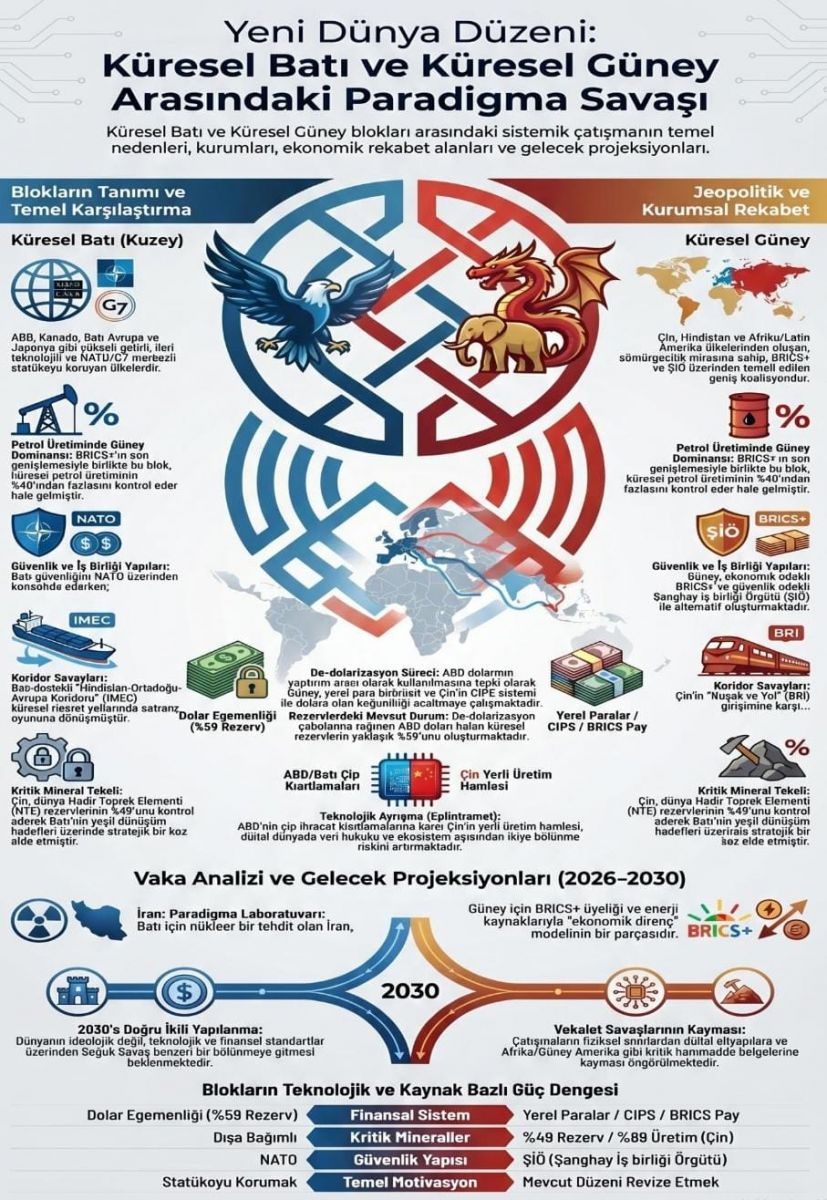 Küresel Batı (Kuzey): ABD liderliğinde, NATO ve G7 merkezli, liberal demokratik değerler ve mevcut Bretton Woods (IMF/Dünya Bankası) finansal sistemini koruma motivasyonuyla hareket eden bloktur. Küresel Güney: Çin ve Hindistan’ın sürükleyici güç olduğu; BRICS+ ve Şanghay İş birliği Örgütü (ŞİÖ) gibi |