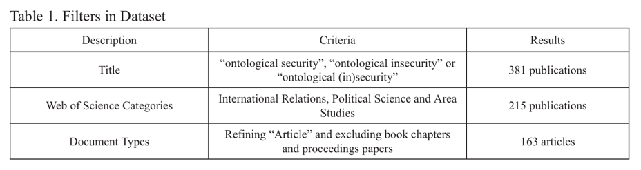 This article has explored the academic literature on ontological security by conducting a bibliometric analysis that uses algorithms like clustering and multidimensional scaling to visualize relationships among units of analysis, such as authors, citations, and countries. As the concept of ontological security is a multidisciplinary topic, it has been necessary to apply filtering to ensure that the focus has remained on critical security studies. Examining a total of 163 articles simplified by filters, this study used the VOSviewer tool for bibliometric analysis and the MAXQDA program for a systematic literature review.