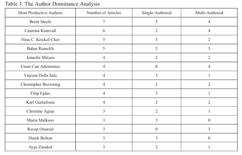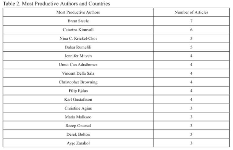 The use of bibliometric analysis, which makes it possible to identify the most prolific writers in a certain time frame, revealed that the majority of works on ontological security have been published recently, particularly since 2017. The data identified 161 authors from 37 nations as the most productive authors in the ontological security literature. With 46 articles, England ranks as the most-producing nation, and Turkey, with 12 articles, comes in fourth.