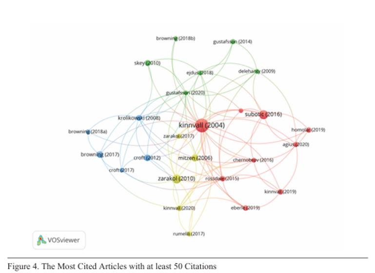 The cited articles are another important aspect of the citation analysis. Citation analysis for authors shows the total number of citations, while citation analysis for articles shows the most cited studies. In their comprehensive reviews, Dale and Goldfnch and Waismel Manor and Lowi highlight the significance of citation analysis as a method for identifying the transmission of ideas. Figure 4 presents the top 25 most cited articles—those with at least 50 citations. Each item in the figure represents a study, and the links between the items indicate their relations in terms of citation. Analysis reveals that although Chris Rossdale is not the most cited or productive author, his 2015 study is one of the most cited articles, with 83 citations. However, Kinnvall (2004) with 655 citations, Subotic (2016) with 253 citations, Zarakol (2010) with 245 citations, Mitzen (2006) with 139 citations, Browning (2017) with 121 citations, Croft (2012) with 117 citations and Skey (2010) with 102 citations, are the most cited documents. The article with the highest number of citations representing Turkey is Rumelili (2017), with 59 citations, as well as two articles by the Turkish author Ayşe Zarakol (2010; 2017) with 245 and 63 citations, respectively.