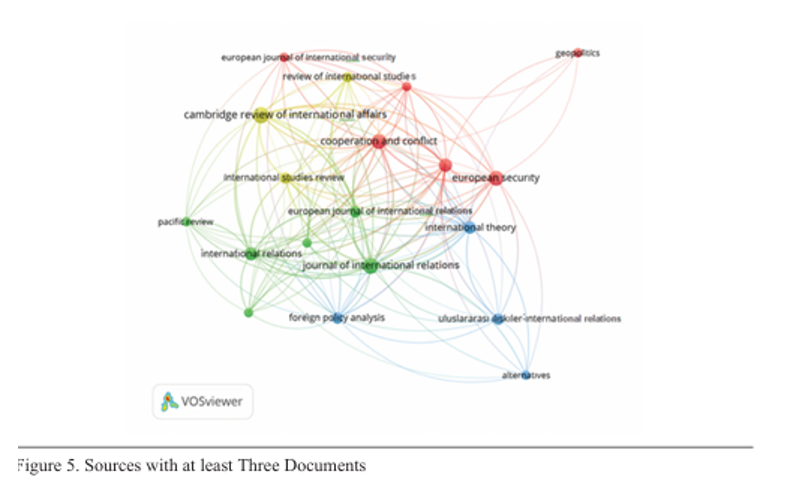 The sources (journals) included in the bibliometric dataset are those that contribute to the advancement of knowledge, as evidenced by the indexes in which they are listed. Figure 5 indicates the most relevant sources for ontological security—those with at least three articles. The links between journals show proximity in terms of citation relationships, and the same color groups represent greater relations. Among these sources, the journals of Uluslararası İlişkiler and Alternatives are edited by Turkish academics.
