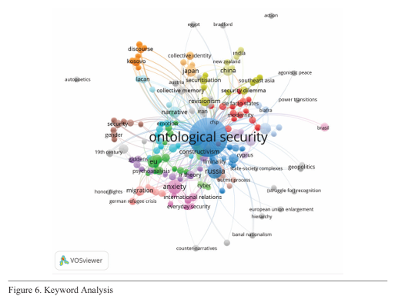 Analysis of co-author networks, most referenced publications, and frequently used keywords are all important tools that may be used to analyze the evolution of the literature in a certain field. By examining co-authorship through measuring the number of co-authored publications, and citation networks by noting the frequency with which scholars quote one another, this study has revealed those groups of researchers who are working together and also those studies that build upon one another. This study’s analysis of author collaboration networks, which demonstrate patterns of cooperation and knowledge exchange, has revealed low levels of collaboration patterns in ontological security studies. The citation analysis, which reviews the most referenced authors and reflects the intellectual structure of the discipline has shown that Western authors predominate in the literature. A keyword analysis, highlighting key study themes in the field, investigating connections between various research areas, and helping identify underdeveloped areas for further research, revealed a total of 415 distinct keywords being used, including “ontological security”, “Russia”, “anxiety”, and “European Union”.