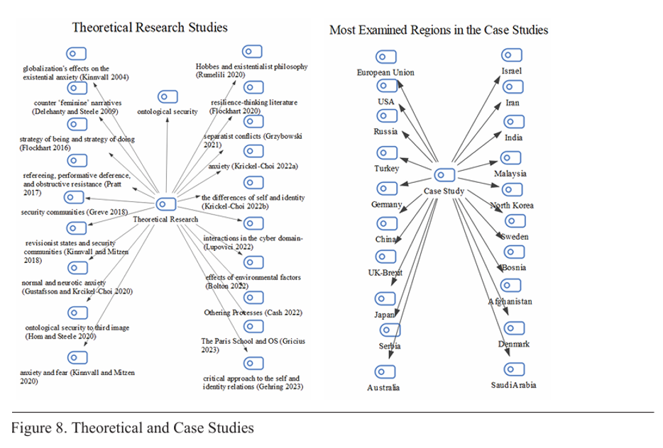 Articles aiming to provide novelty in terms of theories or case studies can be divided into three groups. The first group consists of those that have focused on an in-depth analysis of concepts in an attempt to clarify ontological security, as indicated in the theory section of this article. In addition to the adaptation of new concepts to international relations like “object-cause of desire”, a key concept in the Lacanian perspective, the articles examined in the analysis also clarify the existing concepts by explaining the differences between terms such as normal anxiety/neurotic anxiety, and self/identity. To fill the gaps in the literature, scholars also formulate and use new concepts such as “mission narratives” and “ontological security dilemma”and “temporal security”.