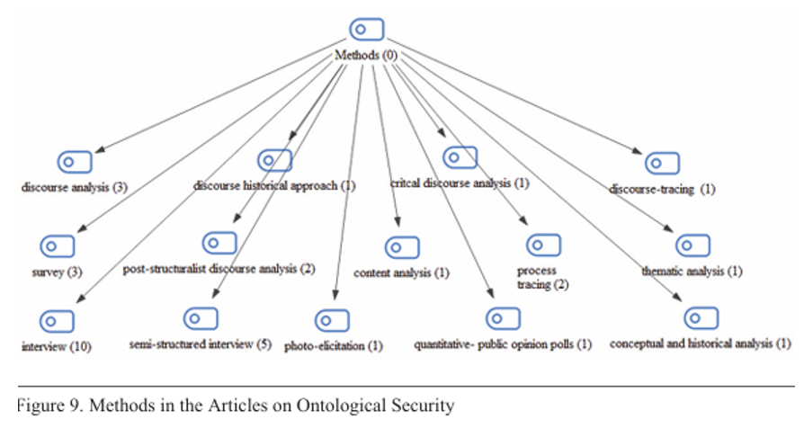 Evaluating articles not only on the basis of their topics but also on their methodology reveals that ontological security studies primarily rely on discourse analysis and its variations, as shown in Figure 9. It can be said that the quantitative articles are primarily based on surveys, content analysis, and public polls.
