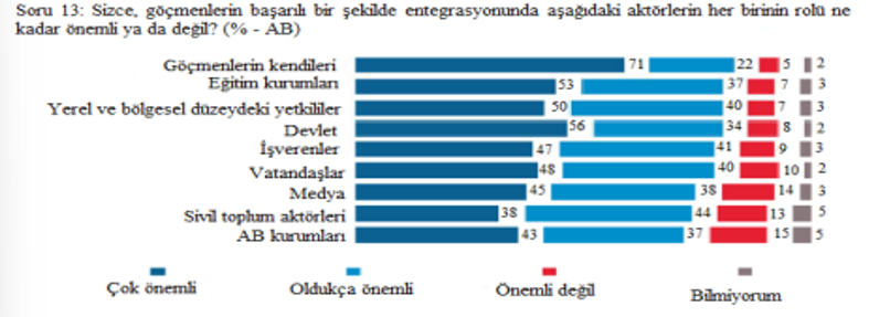Avrupa Komisyonu, Avrupa Konseyi ve Avrupa Parlamentosu, AB içindeki görev, sorumluluk ve konumları ile Kopenhag Okulu’ndaki kolaylaştırıcı koşulları örneklemekte ve güvenlikleştirici aktör olarak ortaya çıkmalarını güçlendirmektedir. Avrupa entegrasyonunu ileri götüren ve AB çıkarını temsil eden Komisyon, yasa yapma sürecini başlatabilmekte, politika rehberlerini (Göç Hareketliliğine Küresel Yaklaşım ve AB Göç Gündemi gibi) belirlemekte ve üye devletler adına geri kabul anlaşmaları gibi siyasi anlaşmalar yapmaktadır. En yüksek siyasi işbirliği düzeyini temsil eden Avrupa Konseyi, Birlik çıkarı için çalışmakta, AB'nin politik yönünü göstermekte, güvenlik konularında önemli rol oynamakta ancak bir yasama rolüne hizmet etmemektedir. Dolayısıyla Avrupa Konseyi, normatif bir sorumluluğa sahip olup Komisyon'un hangi konuları ele alacağına karar vermesine ve gündemi belirlemesine yardımcı olmaktadır. AB vatandaşlarının çıkarlarını temsil eden Parlamento ise, Konsey’in çalışmalarına sorular sormakta, Konsey ile yasama yetkisini paylaşmakta ve zirvelere katılıp belirlediği bir konuda görüşlerini açıklamaktadır. AB kurumlarının göç konusunda önemi, AB vatandaşları tarafından da kabul edilmektedir. Örneğin, Şekil 1’de görüldüğü gibi, Avrupa vatandaşlarının %80’i göçmenlerin topluma entegrasyonunu sağlama konusunda AB kurumlarının rolünün “çok önemli/oldukça önemli” olduğunu düşünmektedir.